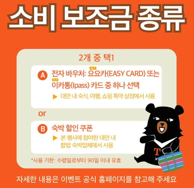 ✔ 전자 바우처(iPass, EasyCard) 또는 숙박 할인 쿠폰 선택 가능
