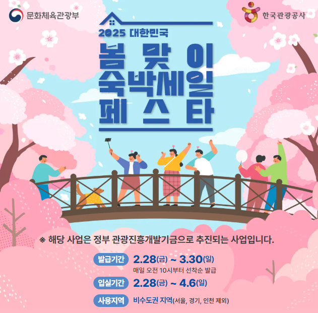 2025 봄맞이숙박세일페스타는 문화체육관광부와 한국관광공사가 주관하는 전국 숙박 할인 이벤트입니다. 서울, 경기, 인천을 제외한 비수도권 지역의 숙박시설에서 할인 혜택을 제공하며, 국민 누구나 참여할 수 있습니다.